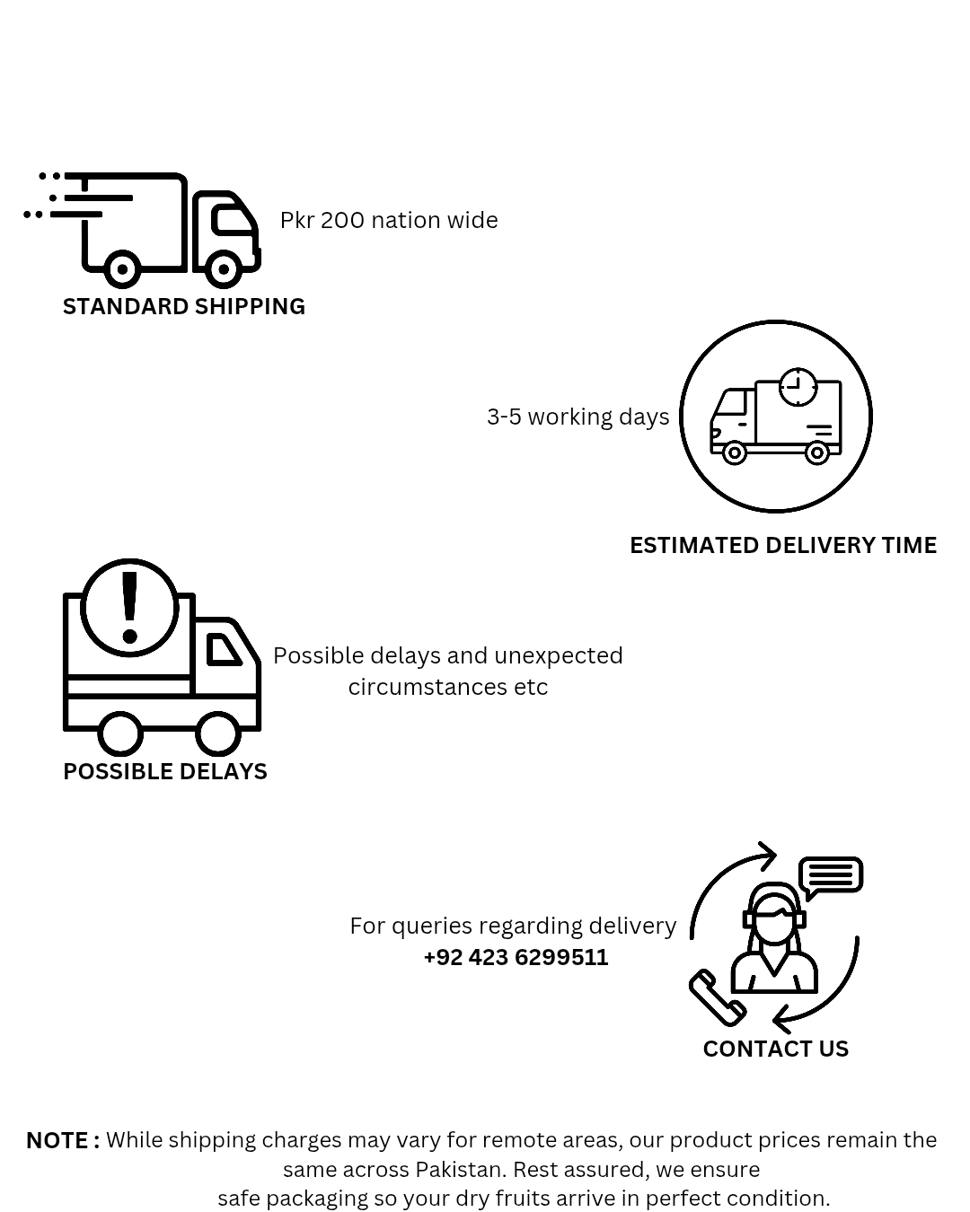 Note: While shipping charges may vary for remote areas, our product prices remain the same across Pakistan. Rest assured, we ensure safe packaging so your dry fruits arrive in perfect condition.